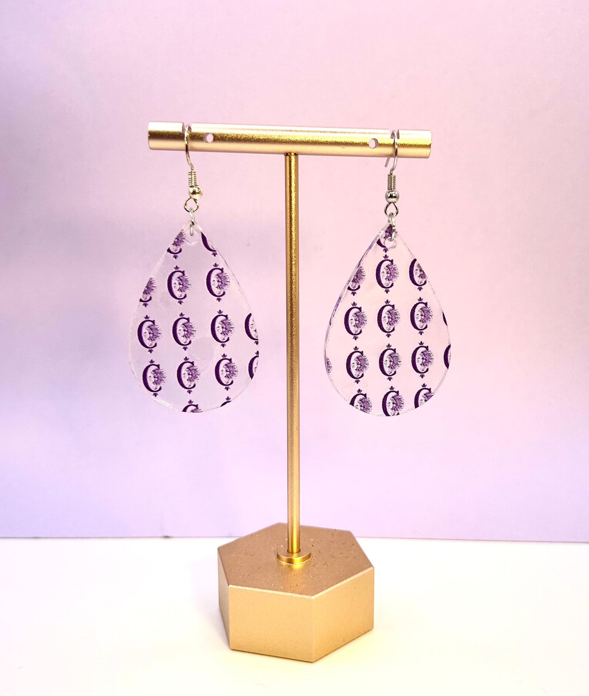 Add a touch of school spirit with these clear acrylic teardrop earrings featuring a fun, scattered Collinsville High School Kahok logo design! The lightweight acrylic offers a sleek, modern look that pairs easily with any outfit. Each earring measures approximately 1¾ inches and hangs from nickel-free fishhook wires for comfortable, all-day wear.