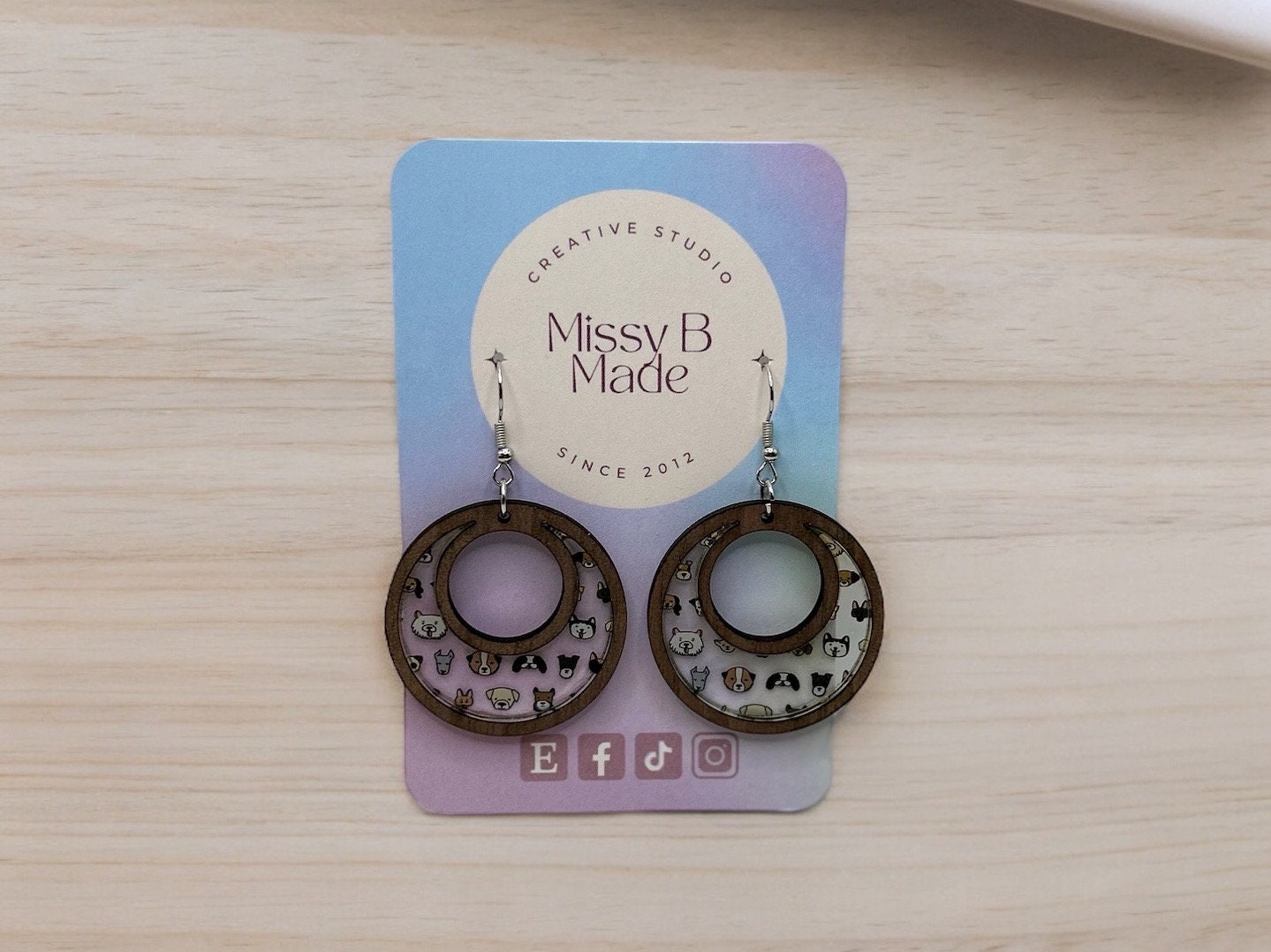 Celebrate your love for dogs and showcase your personal style with these wood and acrylic inlay crescent drop earrings featuring a dog head print on clear acrylic. Add them to your cart today and enjoy wearing a piece of artisanal craftsmanship that reflects your affection for canine companions and creativity.